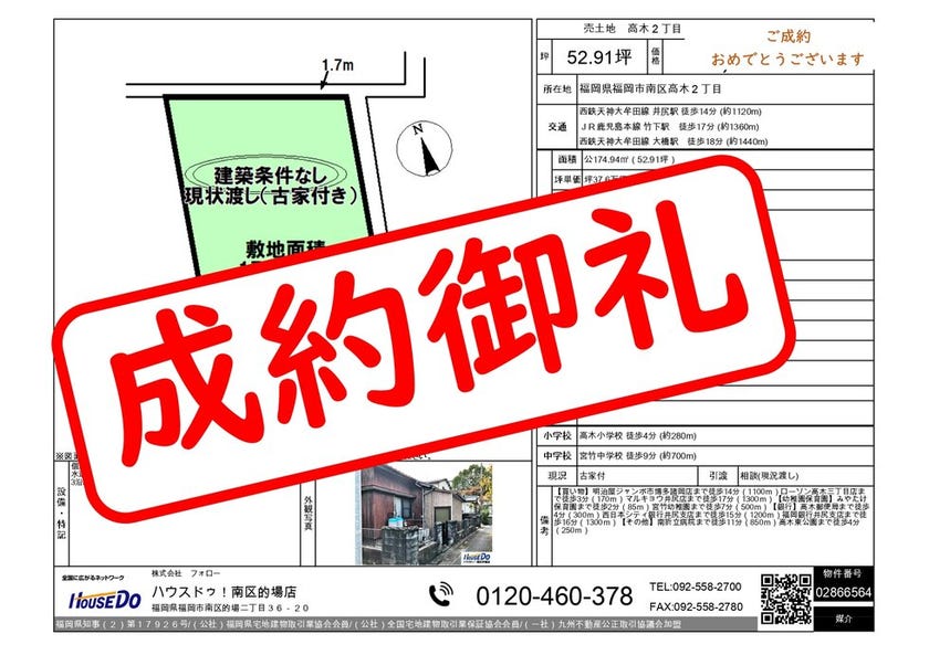 南区高木2丁目 売土地 高木小学校まで徒歩4分 買主D様、売主I様 ご成約おめでとうございます!