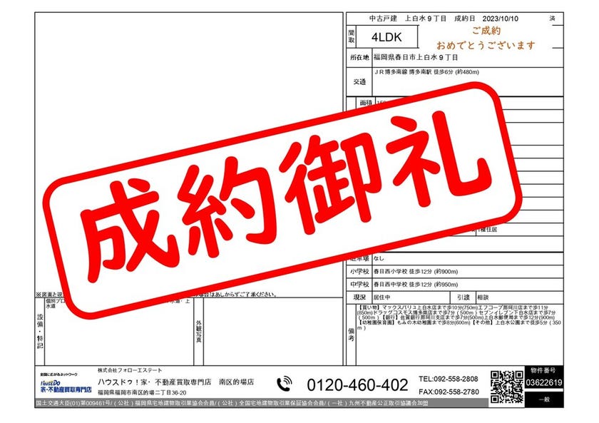 春日市上白水9丁目 中古戸建4LDK 春日西小学校まで徒歩12分 買主A様、売主N様 ご成約おめでとうございます!
